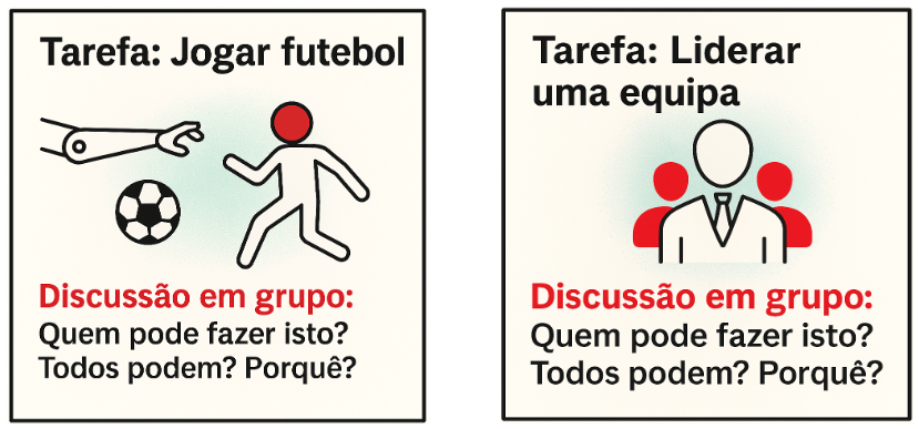 O professor vai distribuir cartões com tarefas (ex.: cozinhar, liderar uma equipa, cuidar de um bebé, jogar futebol). Em grupo, decidem quem pode fazer cada tarefa.