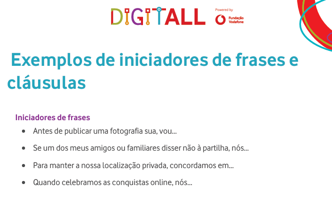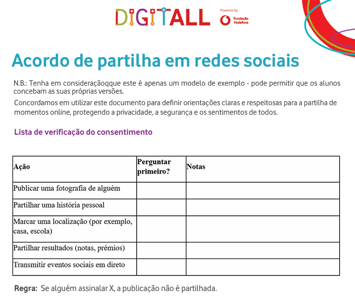 Os grupos podem utilizar, como apoio, o documento Acordo de Partilha em redes sociais: